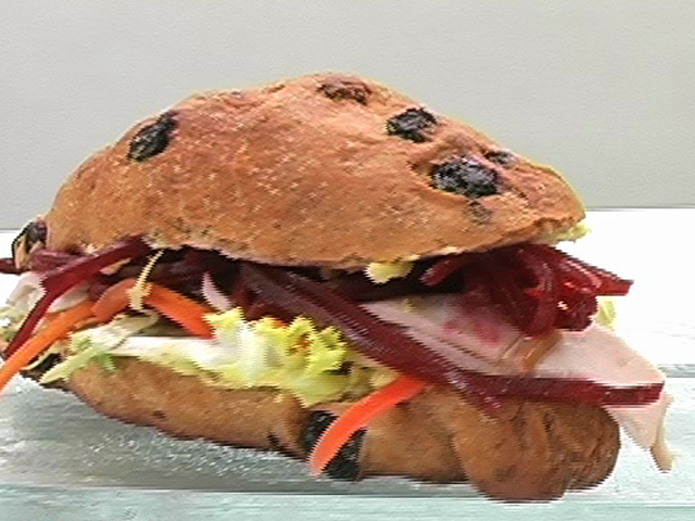 Вкусный и полезный завтрак.Состав:цельнозерновой багет с изюмом — 3 штуки;свекла — 1 часть;морковь — 1 часть;сливочное масло — 60 гр;салат — 3 листочка;куриная грудка — 4 кусочка;соль, перец, оливковое масло, французские травы, английская горчица — по вкусу.
